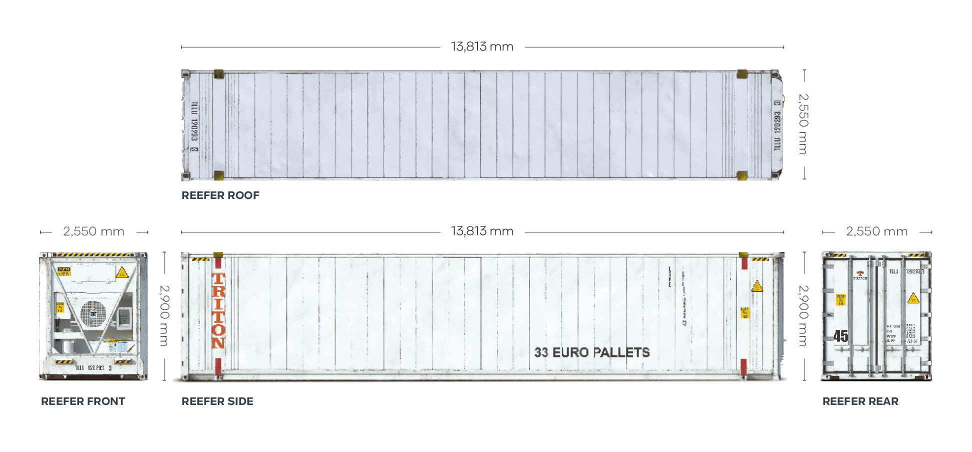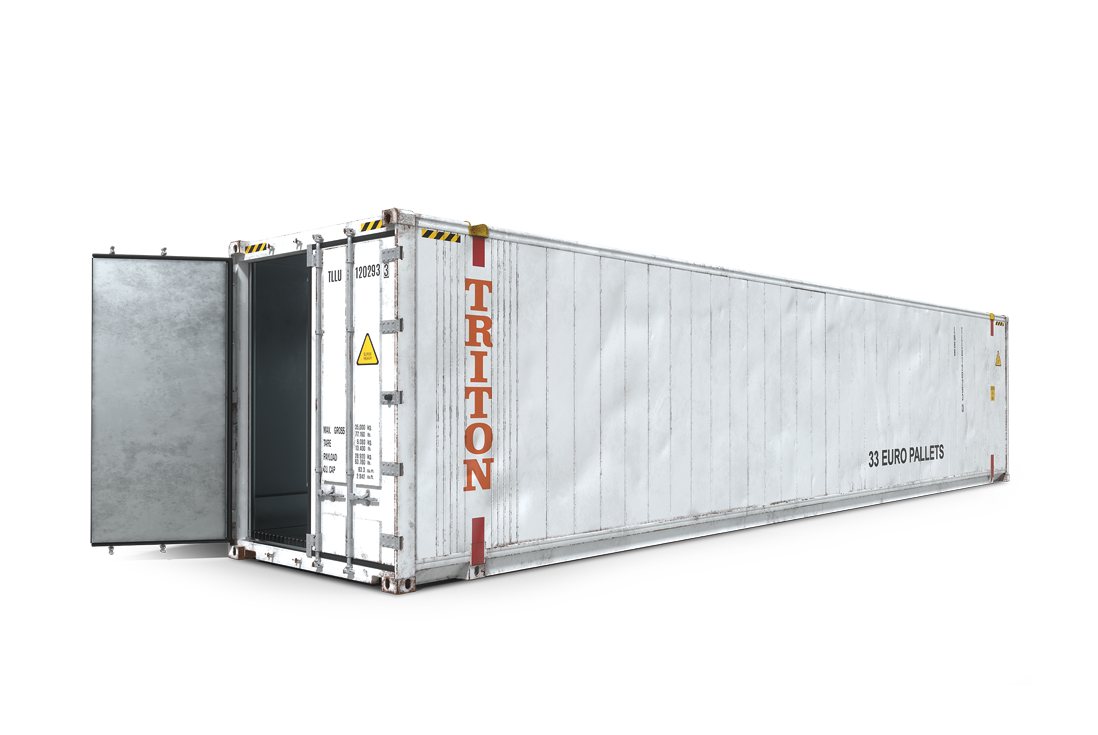 Available globally in a wide range of conditions to suit the individual needs of our customer base, Triton used condition 45ft HC PW Refrigerated Containers have an inside cubic capacity of 2,949ft³ (83.5m³). They can typically maintain a wide range of temperatures from as high as 30°C to as low as -30°C*, and the majority are equipped with stainless steel lined interiors and T-bar flooring.